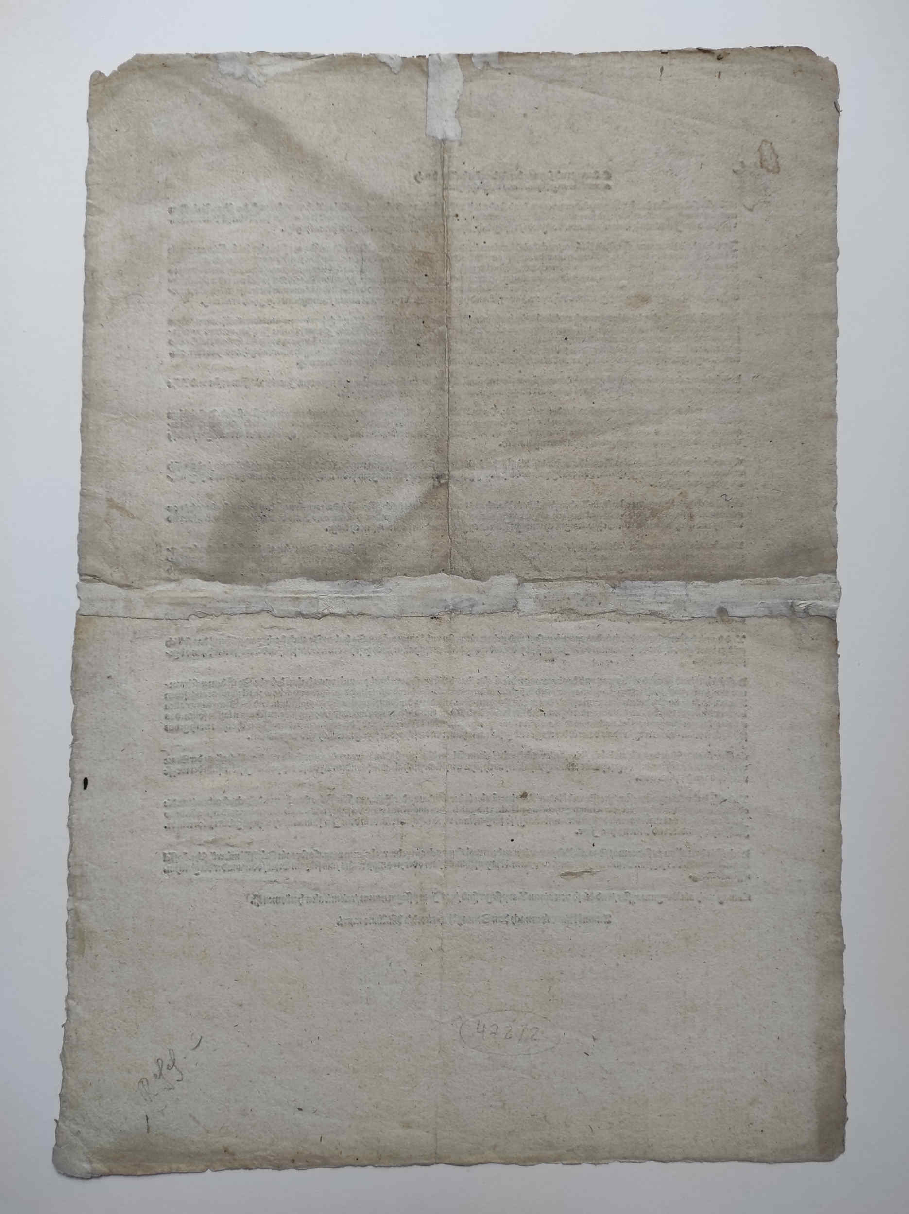 Horizontaler Mittelfalz hinterlegt mit minimalem Textverlust. Kleinere Randeinrisse, minimal fleckig.