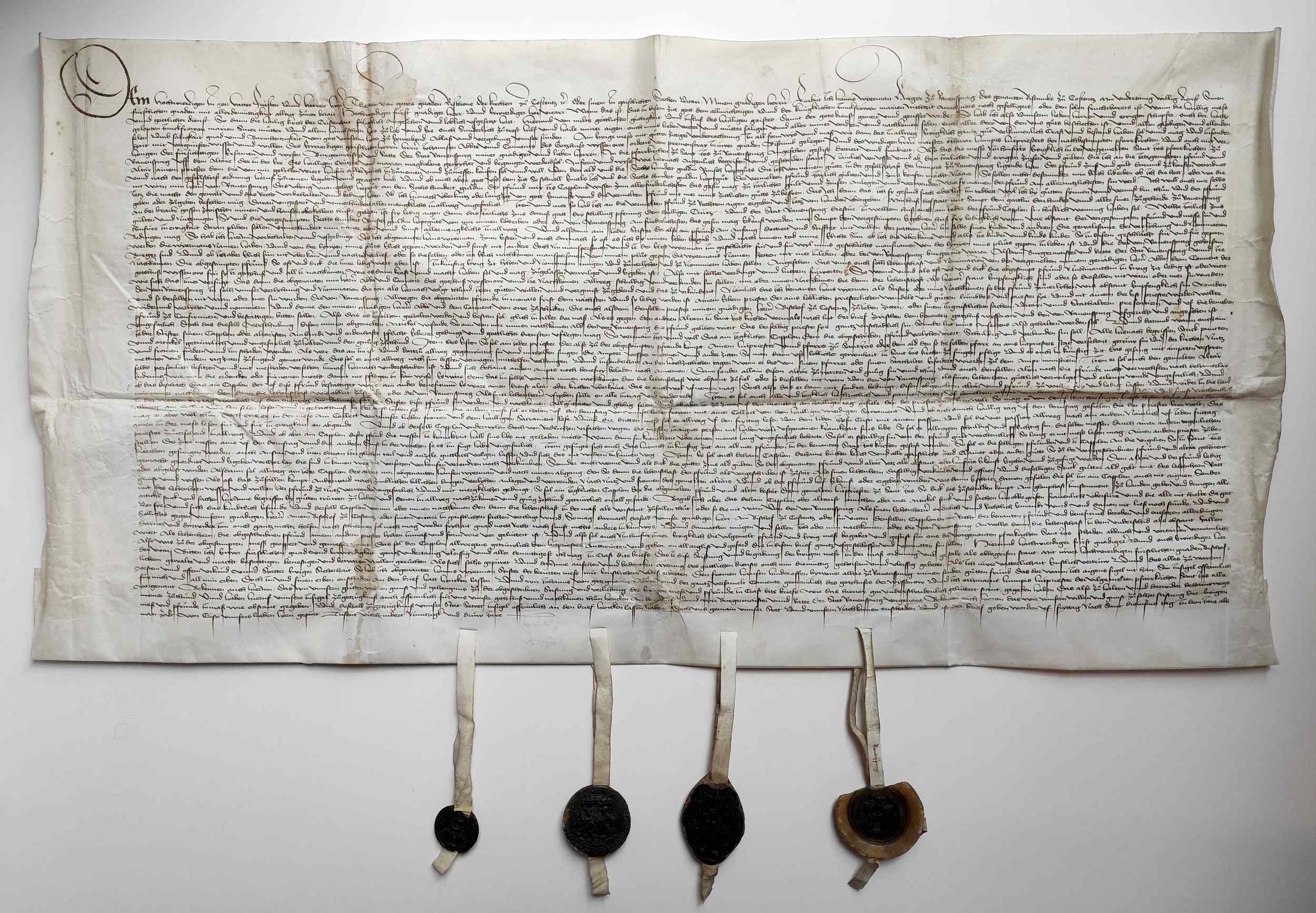 Deutsche Handschrift auf Pergament. 60 Zeilen. 42cm (+6cm Plica) x 84cm. Vier angehängte Siegel.
